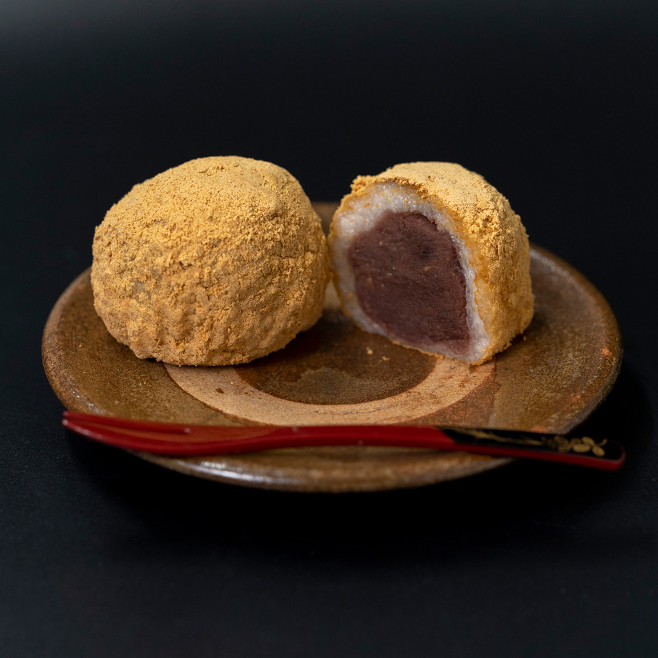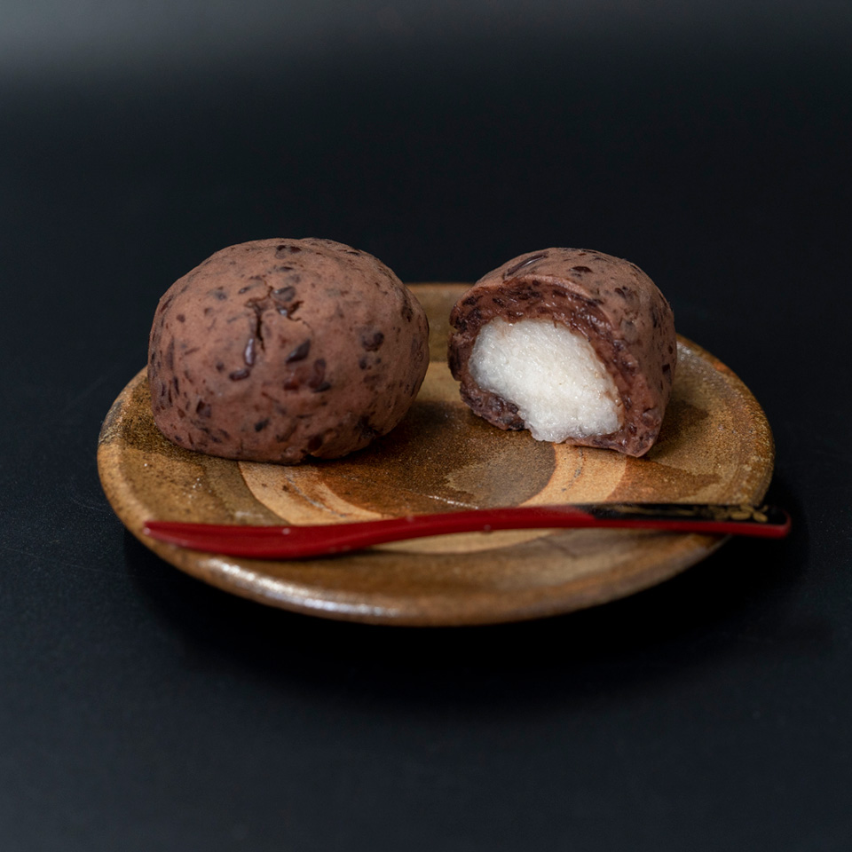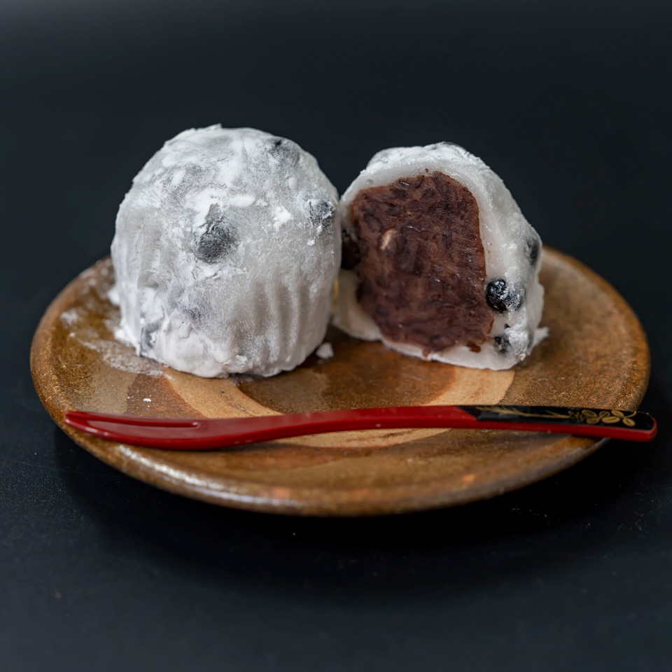 大ぶりな大福餅。滑らかな食感の生地に塩見の赤えんどう豆を散りばめ、 自家製餡をたっぷり包み込みました。