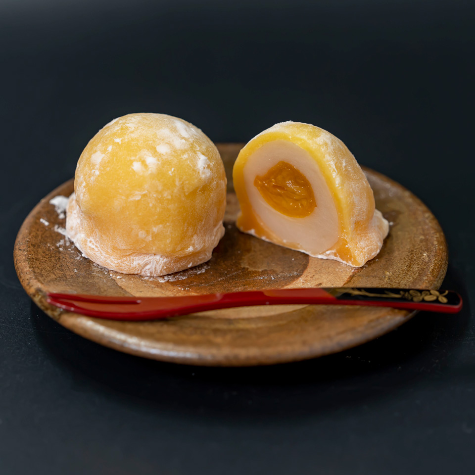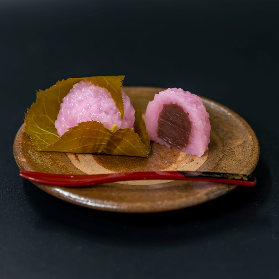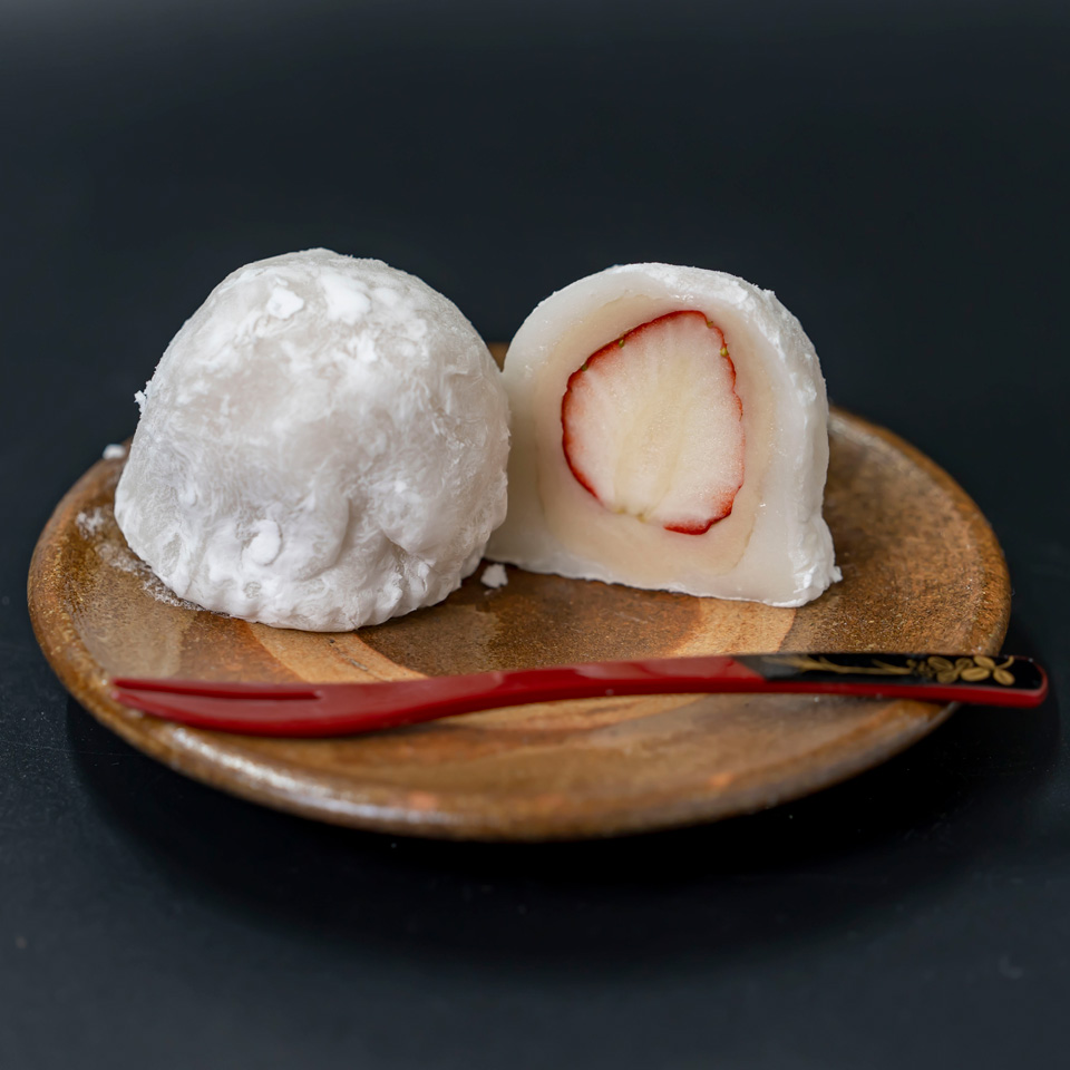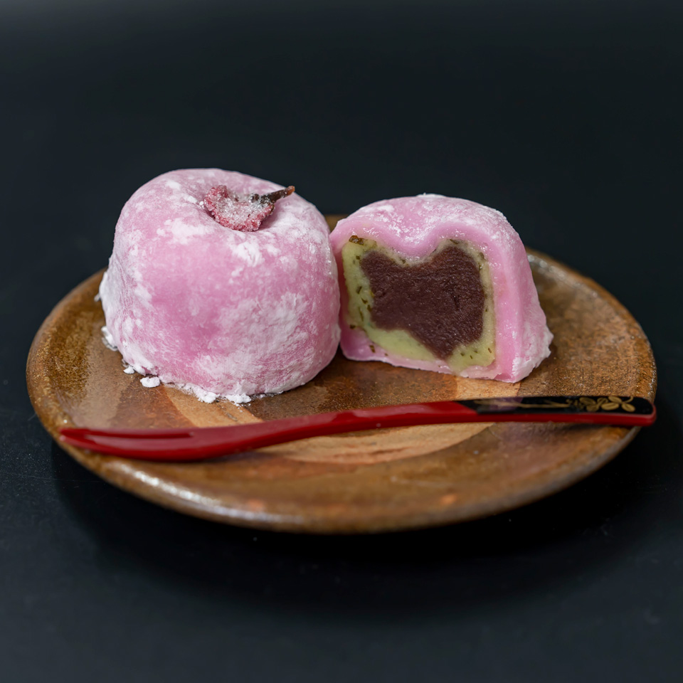 大ぶりな大福餅。滑らかな食感の生地に塩見の赤えんどう豆を散りばめ、 自家製餡をたっぷり包み込みました。