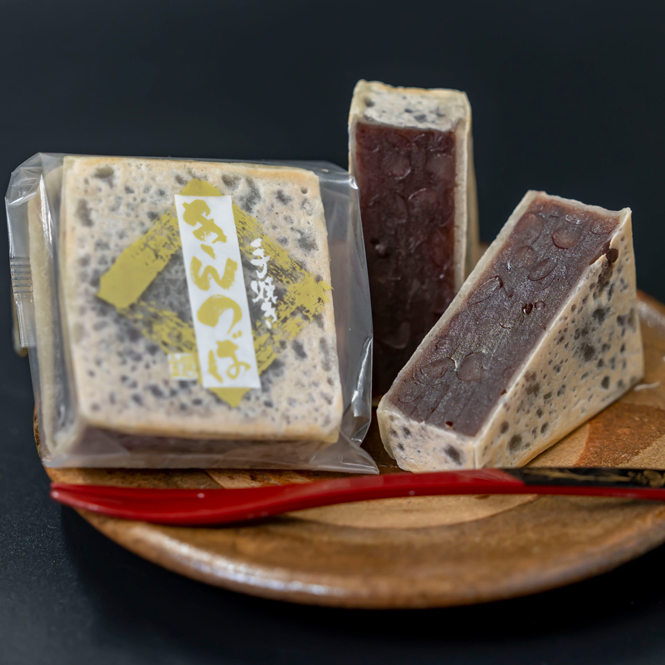 丹波大納言を三日間かけて炊き上げた小倉羊羹です。一つ一つ丁寧に衣で焼き上げました。大納言の風味と味わいをお楽しみください。